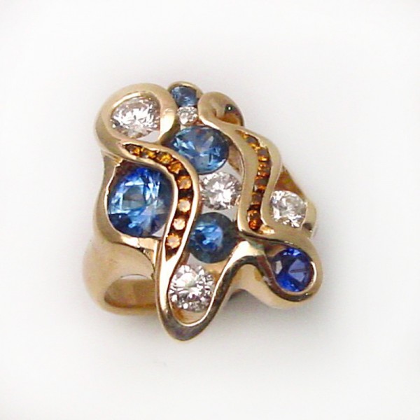 Wonderful rivers of color! This yellow gold design has gold diamonds, blue sapphires and white diamonds channel set in the graceful streams!