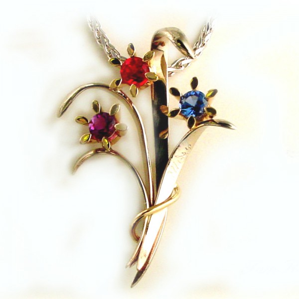 Made from 14k yellow gold stems this floral pendant pin is set with flowers of gems.