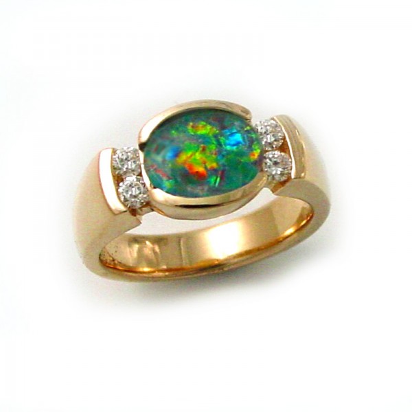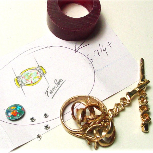 Here are the pieces, old gold, diamonds and an opal from our customer’s mom. Also shown is one of our hand rendered drawings and the wax piece we carved our customers ring from. Our hand drawn renderings are now designed with our state of the art jewelry design software!