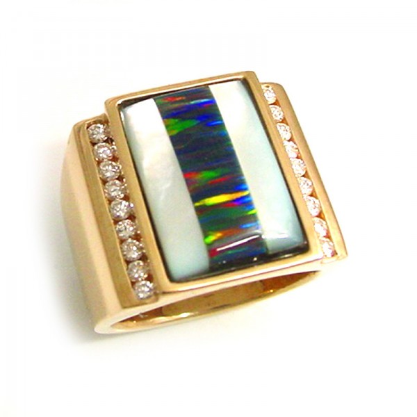A very unique combination of cherry opal, mother of pearl and diamonds all set in 14k yellow gold!