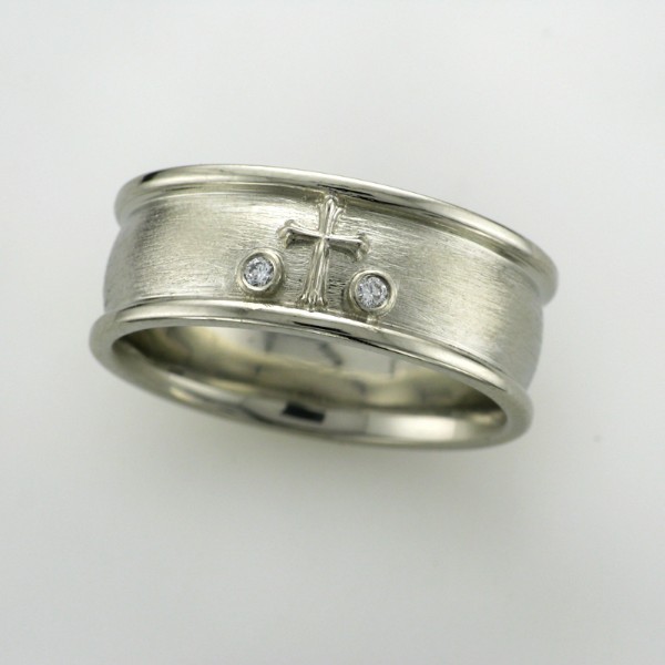 14K white gold wedding band accented with an ornate cross and diamonds and textured with a diamond stylus.