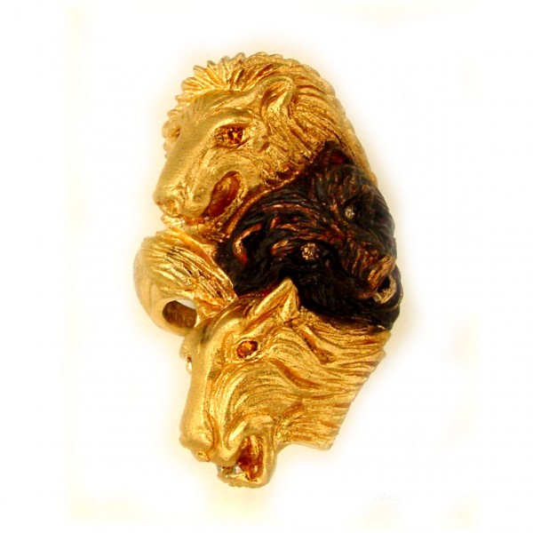 Lions, tigers and bears! Oh my! This ring is made in 18k yellow gold with special treated brown gold for the bear. We brought them to life with gold diamonds in the lion and tiger and chocolate brown diamonds for the bear. The teeth are rhodium finished to give them the fierce drama they deserve as kings of the jungle and desert! And on the back we designed a chessy cat grinning, blue diamond eyed mouse who has the tiger by the tail. His name is… you guessed it….OH MY!